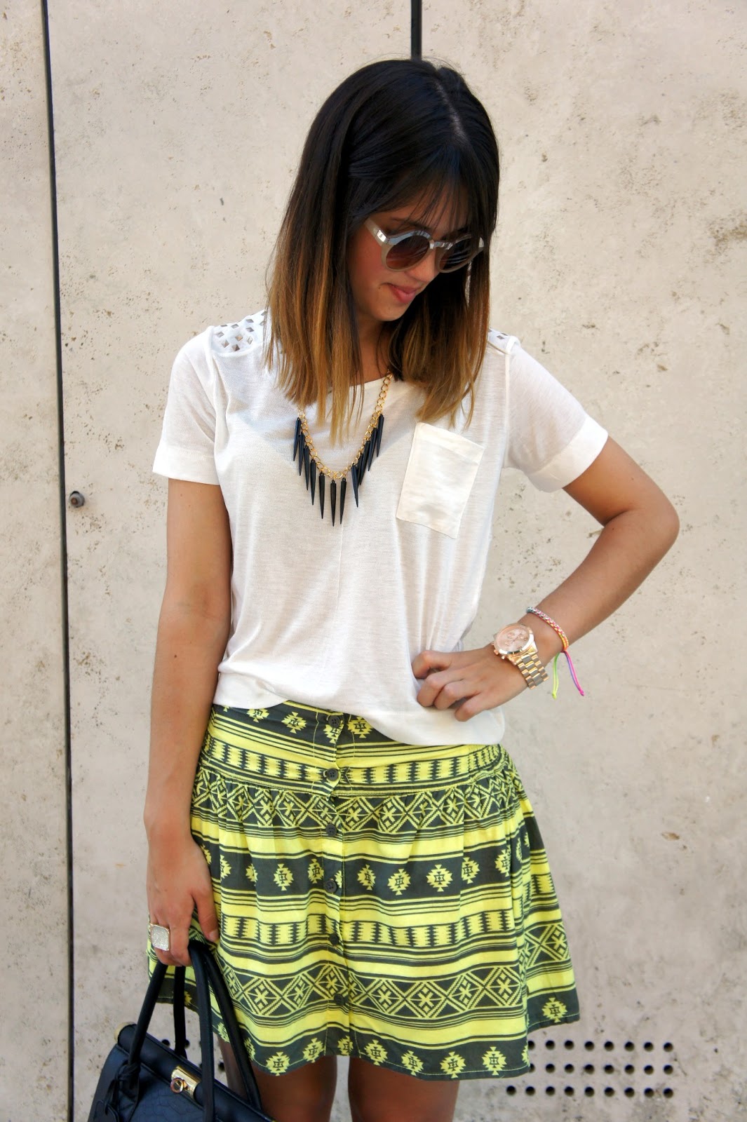 Remera, Inversa - Pollera, Como Quieres Que Te Quiera - Collar y pulsera de colores, Todo Moda - Chatas y lentes, Asos - Cartera, Primark - Reloj, Aldo - Anillo, Charlotte Russe